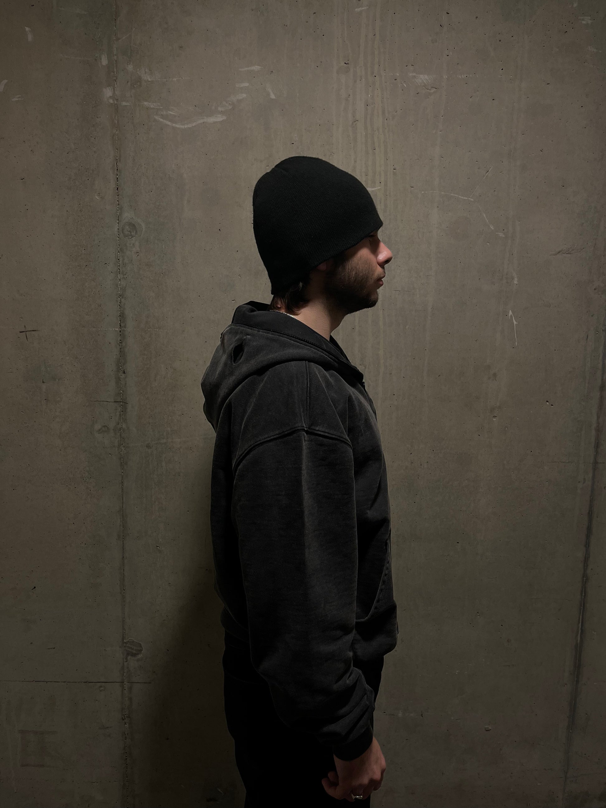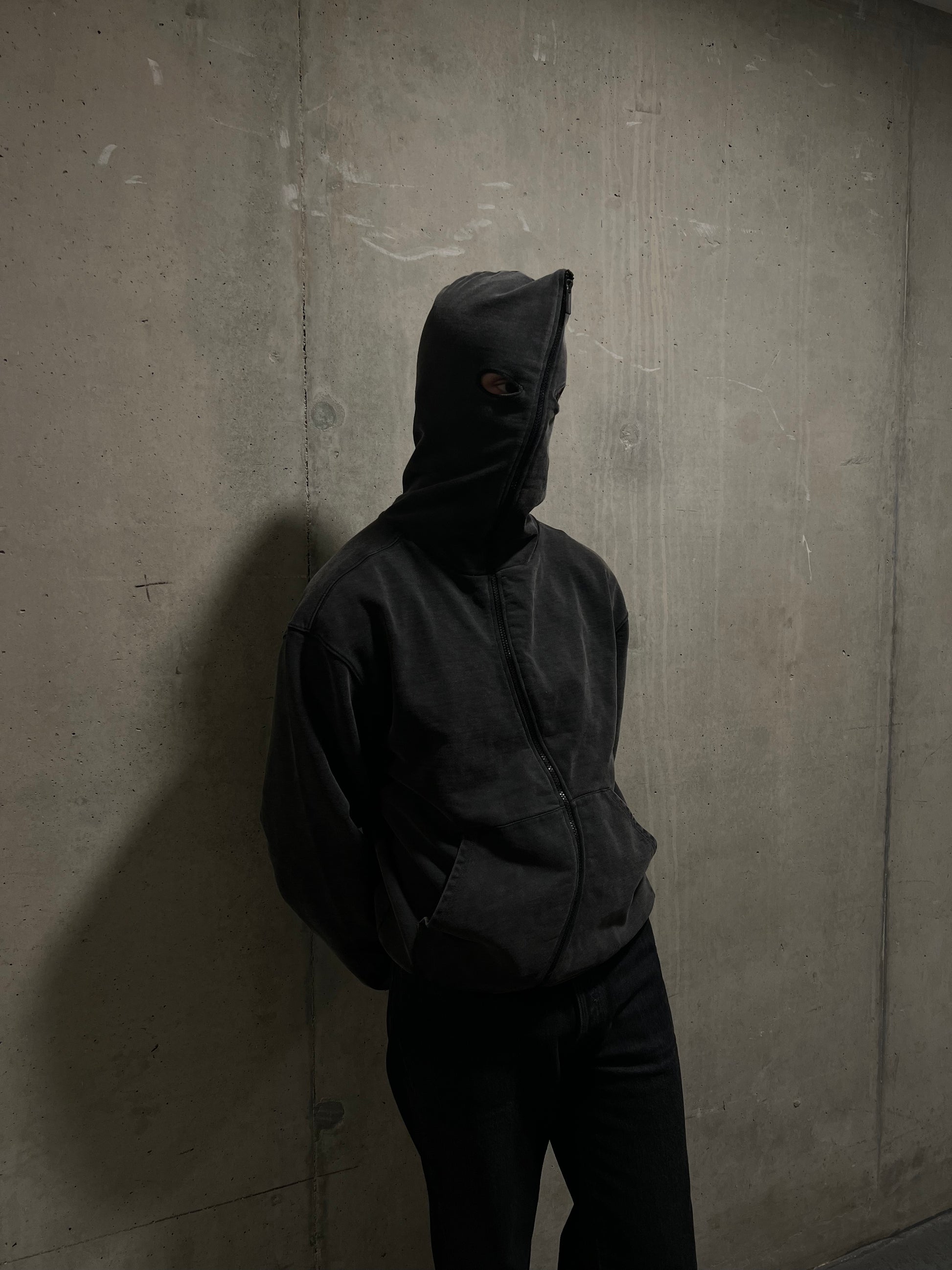 Heavy weight hoodie with a curved zip and functional eye holes.